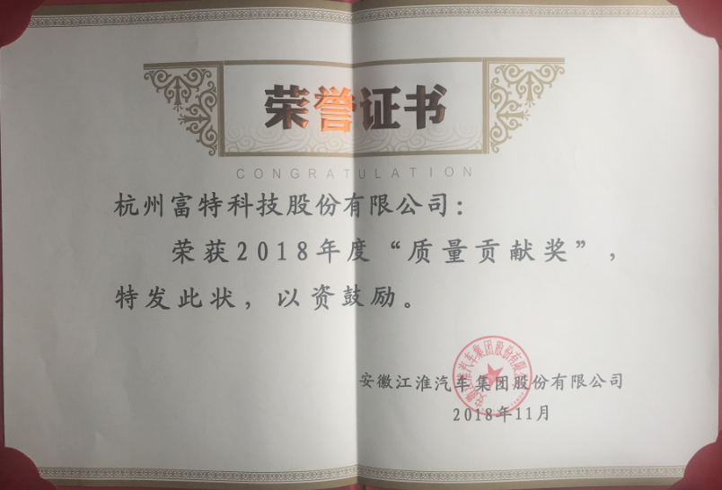 2018年11月26日,公司在江淮汽車集團主辦的年度供應商大會上榮獲2018年度“質量貢獻獎”,為公司零缺陷的經營目標再添一筆精彩的注腳??偨浝砝顚幋ㄏ壬H自出席并登臺領獎,充分顯示了公司對這一獎項的高度重視。